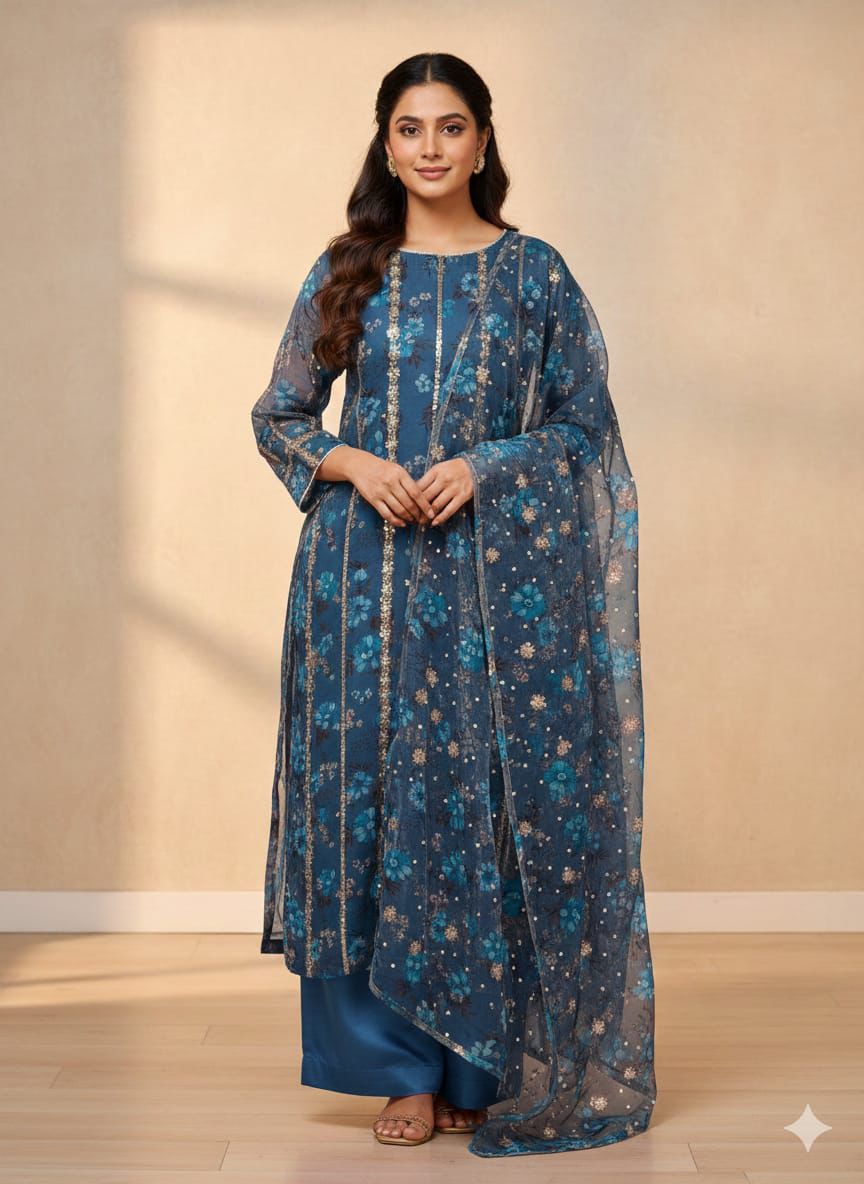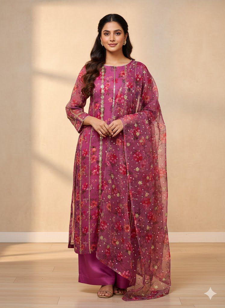 Make a graceful style statement with the Moti Three Piece, designed for a luxurious and festive look. The outfit features a chiffon shirt adorned with delicate moti work, paired with a flowy silk sharara that adds rich elegance. Finished with a beautifully digital printed dupatta, this ensemble is perfect for weddings, parties, and special occasions.